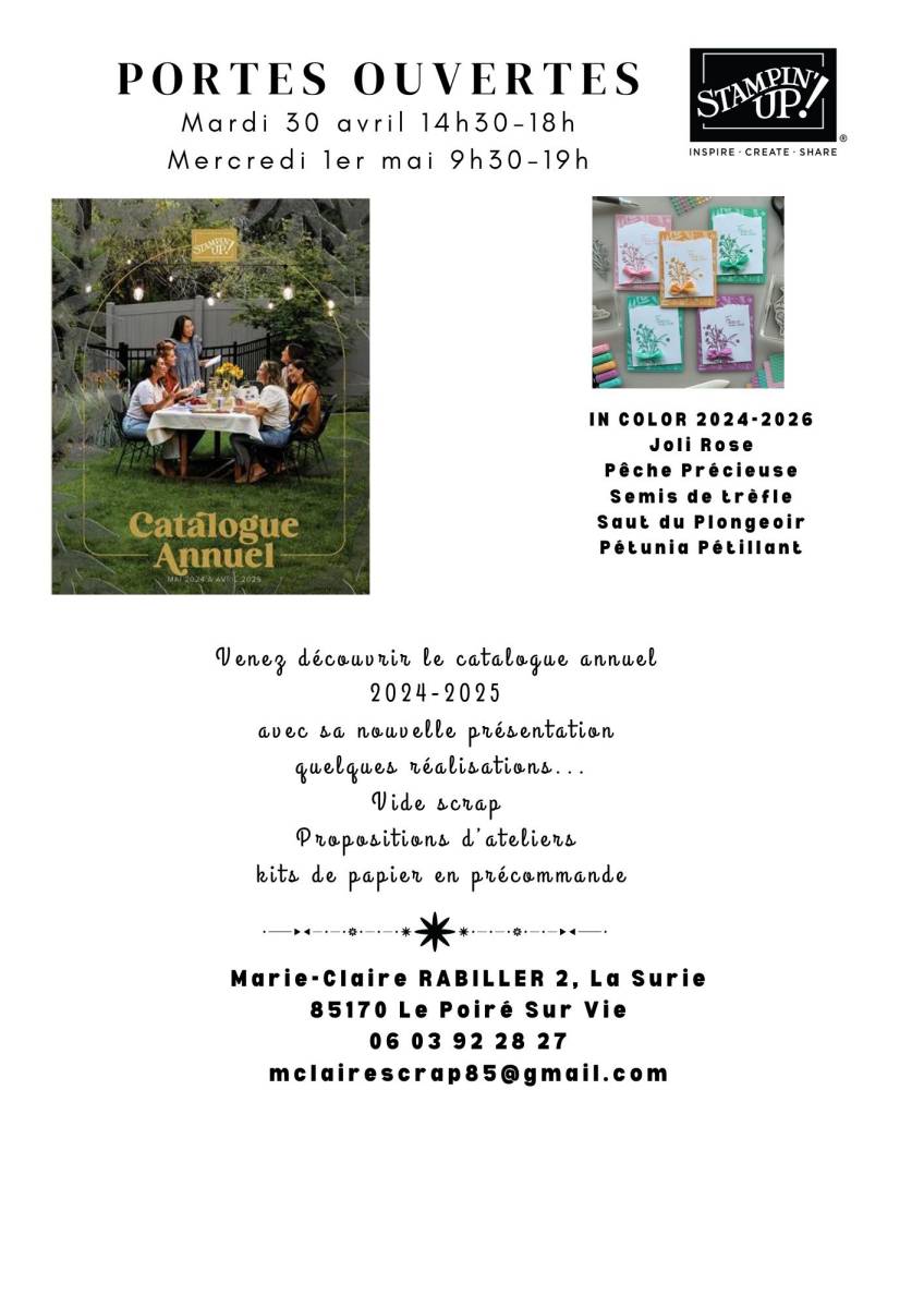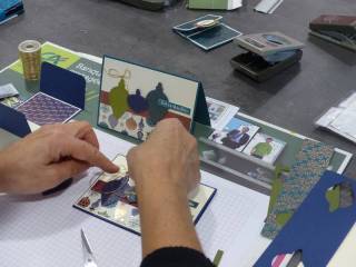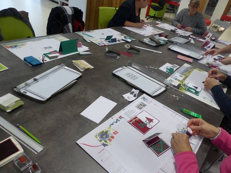 Kits fournis et matériel à disposition. Il vous suffit d’apporter votre matériel de base (Colle –double face-carrés 3D- ciseaux –règle-crayon papier-gomme-tapis de découpe- tapis pour tamponner ou tapis de souris, massicot …)